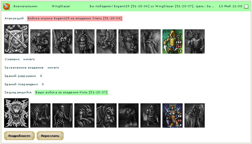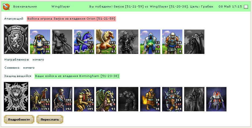 Итак, моя первая эпопея: Нужно было делать войну фракций-150 000 по таймеру. Оставалось немного добрать. И тут я обнаружил город с конями на витрине (вот подарок!) Но игрок оказался из активных. И спустя полдня (видимо как появился) он пошел мстить: Тут я просчитался. Ибо варианта было два: Или мстя будет ужасной (тогда у него отступление при 100% потерь) или мстя будет молниеносной (тогда отступ при 50% - ибо некогда еще и отступы менять. возмездие не ждет). Я поставил на первый вариант и оставил пехоту. А случился вариант второй. При первом варианте у меня меньше потерь с пехотой, а при втором наоборот.
