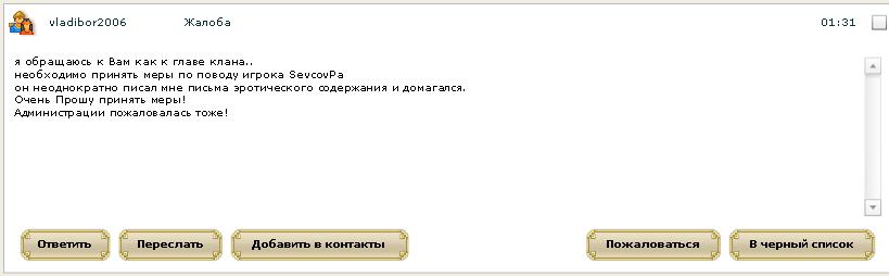Странно, т.е. помощь союзникам и друзьям теперь говорит о том какая глава "плохой человек" и дает тебе право рассылать типа таких вот лживых писем в ЛС членам её клана?Denis писал(а):За ней - участие в срыве двух наших клановых операций. Первая - это слом твоего КС, вторая - захват СО у пятницы